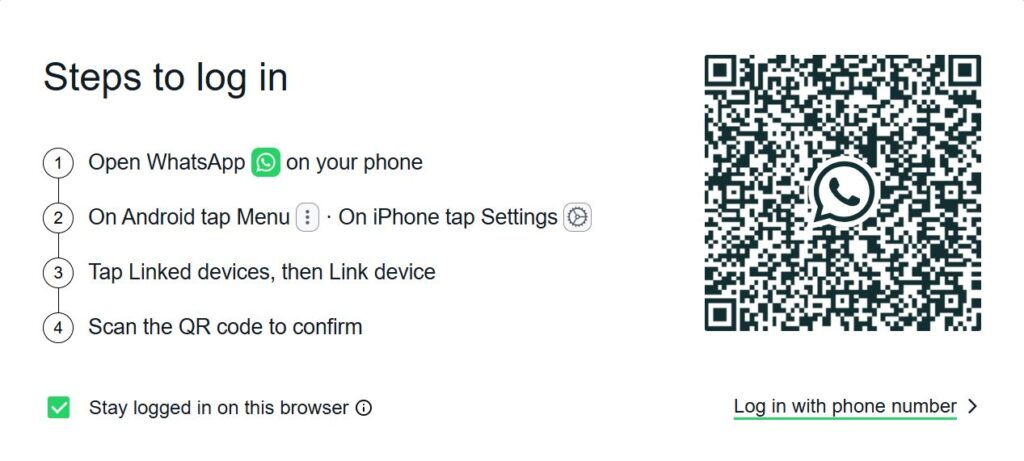 Go to web.whatsapp.com in Chrome, Edge, Firefox, or any modern browser.